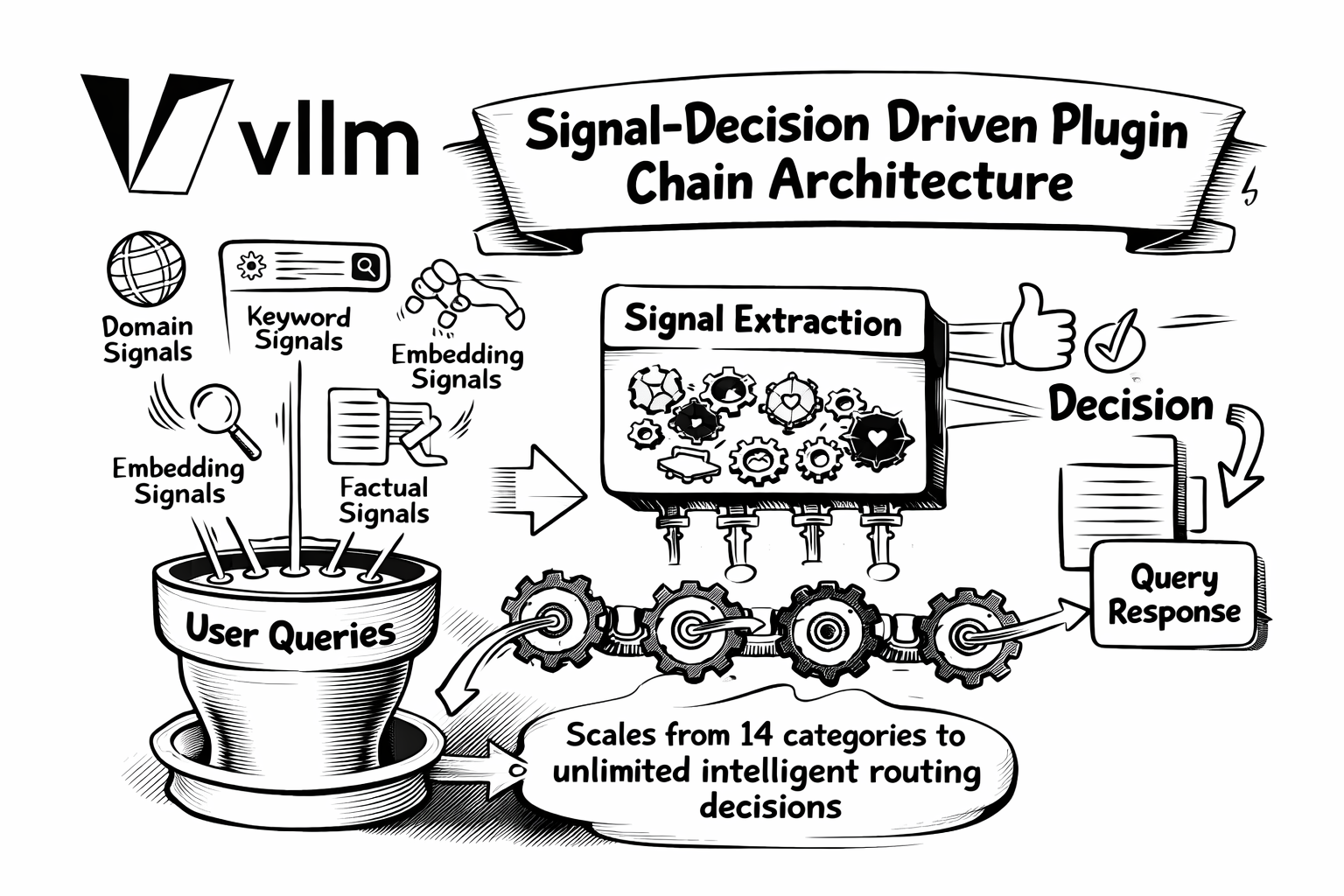 Now: We've introduced the Signal-Decision Driven Plugin Chain Architecture, a complete reimagining of semantic routing that scales from 14 fixed categories to unlimited intelligent routing decisions.