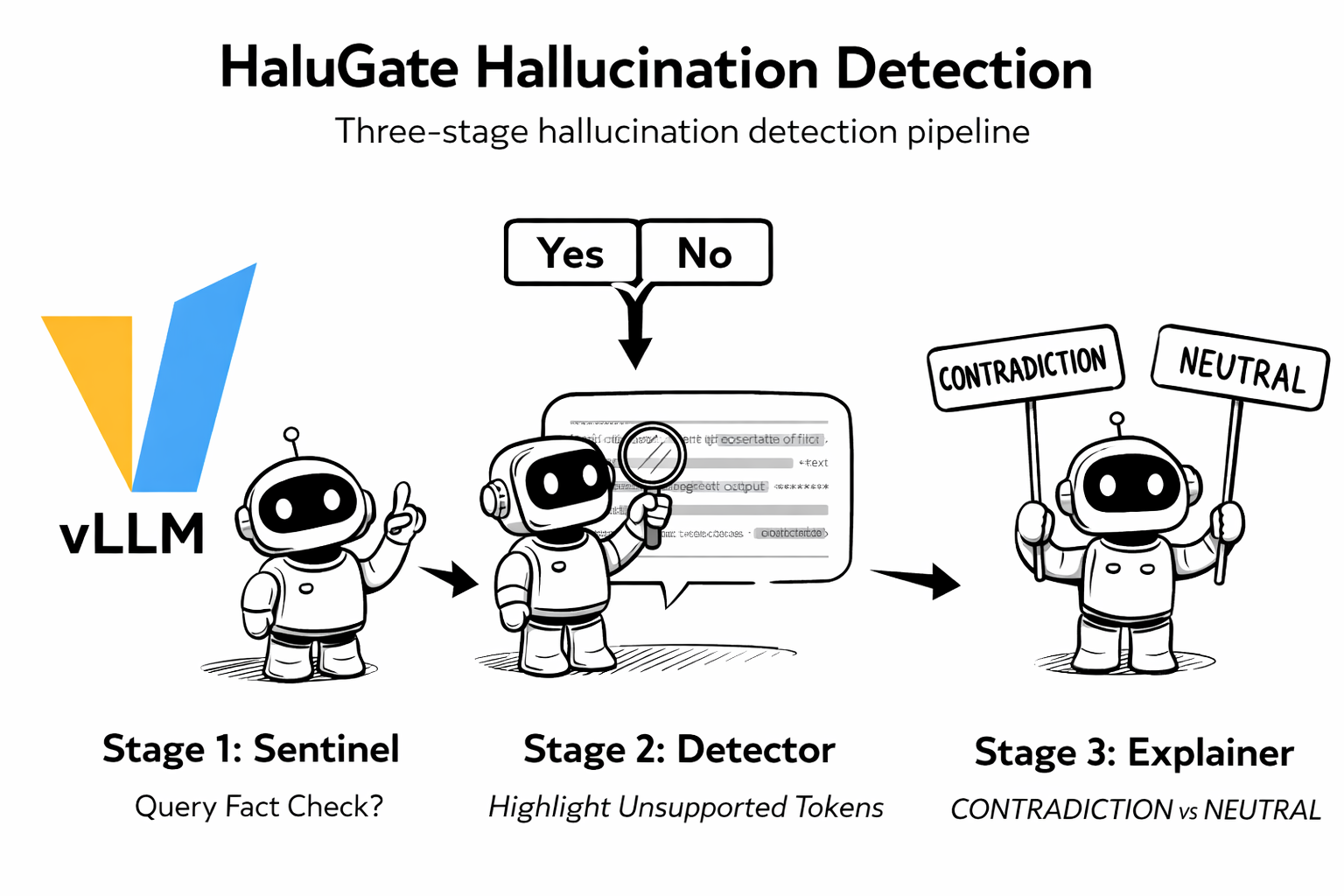 Beyond request-time safety (jailbreak, PII), v0.1 introduces HaluGate—a three-stage hallucination detection pipeline for LLM responses: